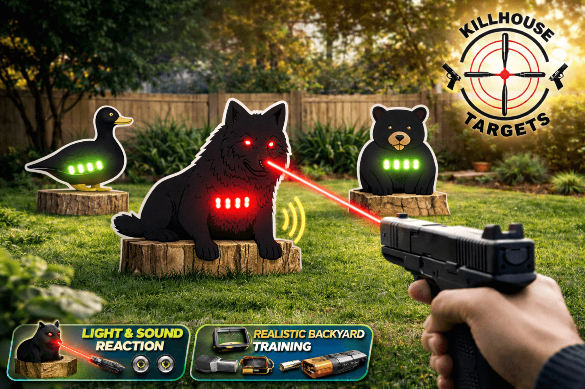 Practice your firearm and self defense skills from the comfort of your own home. Shoot indoors using interactive light-up animal targets and a red laser powered bullet system.